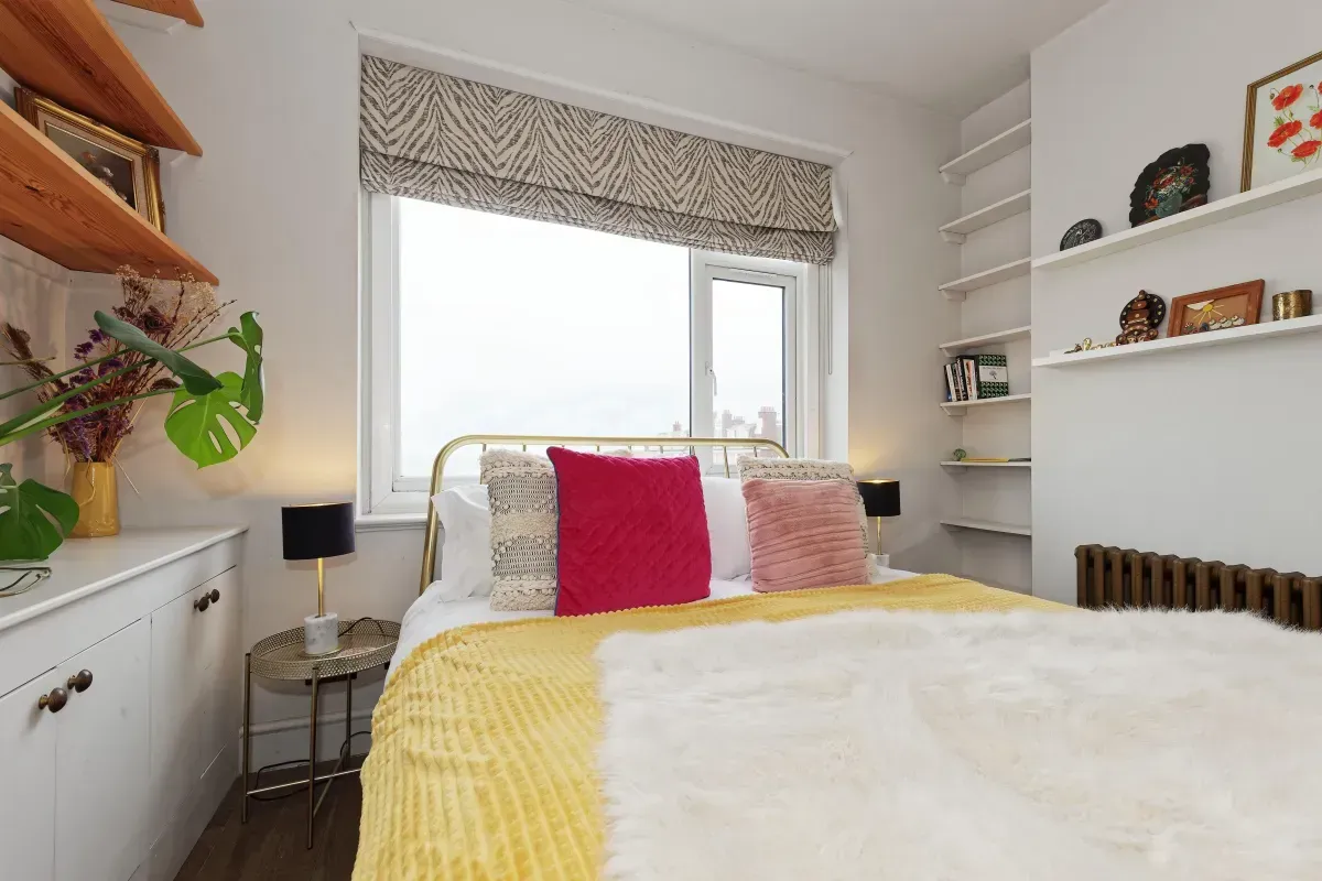 The main bedroom has a king size brass bed, a wicker chair and lots of cupboard space. Fantastic sea views, just mins from the beach and wild swimming. Walk 20 mins along the coast into Margate Old Town, or up to Northdown Road for eclectic shops.