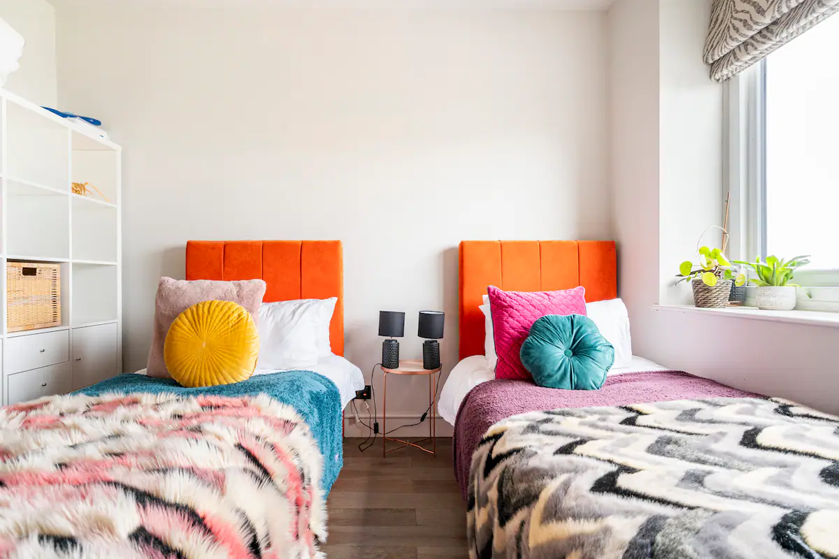 The second bedroom has twin zip n link beds with velvet head boards that can also be set up as a stylish super king bed (just ask) making it perfect for children, singles, or a couple. Fantastic sea views, just mins from the beach and wild swimming.